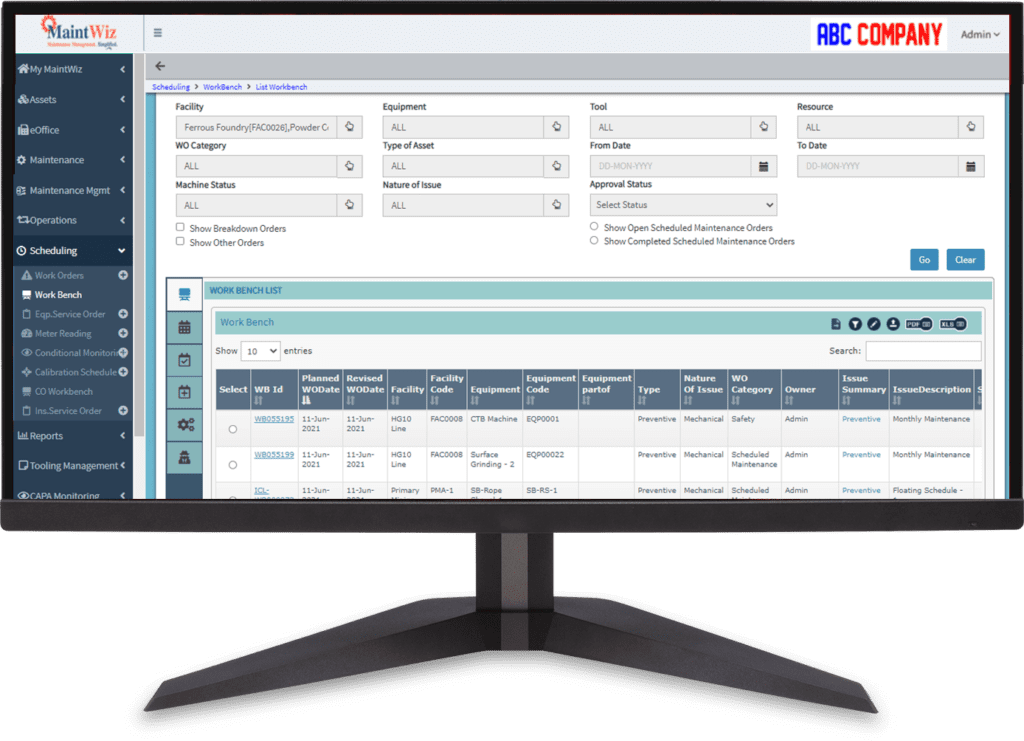 4. Planning Workbench for effective PM program execution: Adjusting the preventive maintenance work orders generated out of the long-range scheduling to meet short-term, tactical on-ground realities without impacting the master schedules. PM plans can be optimized based on equipment availability, resource levelling, spare parts and tools availability, Vendor, AMC / Warranty service provider visits etc.
